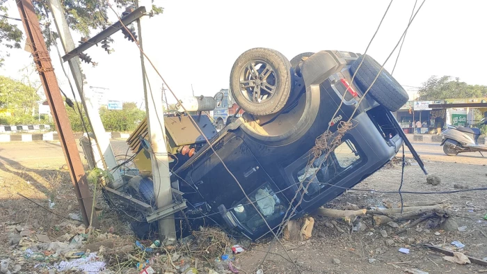 इंदौर-भोपाल रोड पर साउथ की फिल्मों की तरह हवा में उछलकर 80 फीट दूर ट्रांसफार्मर के खंभे से टकराई थार